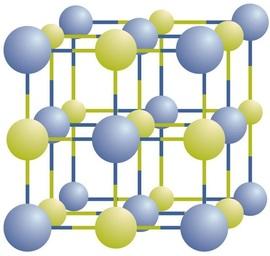 In a sodium chloride crystal, positive and negative ions are arranged in a 3D lattice and alternate their positions in the structure (Credit: Chemlibretexts)