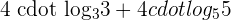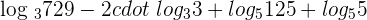 As you can see that this is a complex example which involves many logarithmic factors in a single expression. We will apply logarithmic rules to solve this expression. There are two logs with the same base 3 and other two log with the same base 5. Apply logarithm quotient rule to the first two factors of the expression because a negative sign is involved. Similarly, apply logarithm product rule to the last two factors of the expression because they have a positive sign between them.