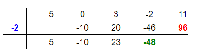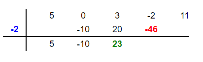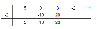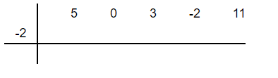 The coefficients of the dividend are 5 , 0, 3 , -2 and 11. The root of the divisor is -2.