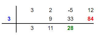 The coefficients of the dividend are 3 , 2, -5 and 12. The root of the divisor is 3.