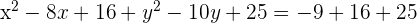 In this example, the coefficient of x is 8. First we will divide it by 2 to get 4. Now, we will add the square of 4 to both sides of the equation. Similarly, the coefficient of y is 10. First, we will divide 10 by 2 to get 5, and take the square of 5 and add it to both sides of the equation.