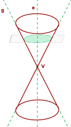 A conical surface is formed by the rotation of a line, g, (also called the generatrix or generator) around another line, e, the axis, which is fixed at the point V, the vertex or apex, which forms the angle α.