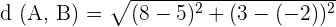 Calculate the distance between point A (5, -2) and point B (8, 3).