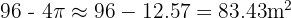 A rectangular garden measures 12 m by 8 m. A circular pond with a radius of 2 m is in the centre. What is the remaining garden area (excluding the pond)?