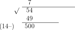 Double the number above the square root symbol and write it on the left hand side with a dash at the end because we still have to figure out the third digit. In this example, the 2 multiplied by 7 is 14, so we will write (14_) on the left hand side like this: