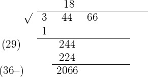 Double the digit above the square root symbol and write the number again in parenthesis on the left side. Put blank on the right hand side of the digit because the third digit is unknown. In this example, the number above the square root is 18, so by doubling it, we will get 36. We will write (36 _) on the left side like this: