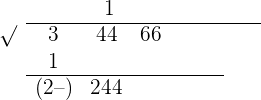 Now, in this step, you need to start with the first group (the left-most group). If you have an odd number of digits in a number, then the group may have a single-digit only. Find the greatest square that is less than or equal to that group and find its square root. Write the square below that group and the square root of the number above. In this example, the greatest square that is less than or equal to 3 is 1. We will write 1 above and below like this: