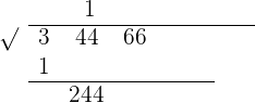 Multiply 28 by 8 to get 224. Place 8 above the square root symbol and 224 below 244 and subtract the two numbers like this:
