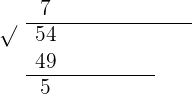 Find the perfect square that is less than or equal to 54. In this example, that perfect square is 49. Take the square root of 49 and place the number above the square root symbol. Write 49 below 54 and subtract the two numbers.