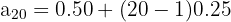 A library fine starts at £0.50 on the first day and increases by £0.25 every day after that. Write an explicit formula for the fine on day n and calculate the total fine on day 20.