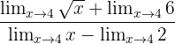 - Quotient Rule - The limit of a quotient is the quotient of the limits, provided the denominator is not zero: