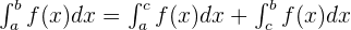 If c is a point inside the closed interval [a, b], then we break down the definite integral as a sum of two integrals in the closed intervals [a, c] and [c, b]. Mathematically, we can write this property like this: