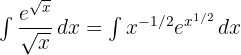Rewrite the integrand by moving the exponential from the denominator to the numerator using negative indices: