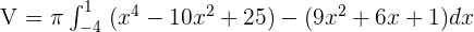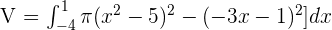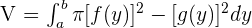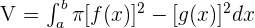 The volume V of a solid produced by revolving the region bounded by y = f(x) and y = g(x) on the closed interval [a, b], where , about the x-axis is:
