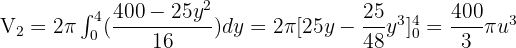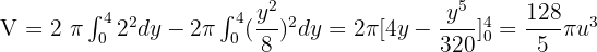 Since the parabola is symmetrical about the x-axis, the volume is equal to two times the volume generated between y = 0 and y = 4.