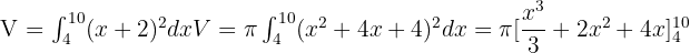 Find the volume of the truncated cone generated by the trapezoid contained by the x-axis, the lines y = x + 2, x = 4 and x = 10, which turns around the x-axis.