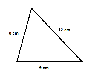 The values of sides a, b and c are 12 cm, 9 cm and 8 cm. First we will calculate the semi perimeter by substituting these values in the below formula: