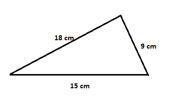 The values of sides a, b and c are 18 cm, 15 cm and 9 cm. First we will calculate the semi perimeter by substituting these values in the below formula:
