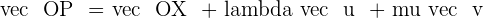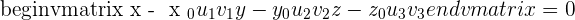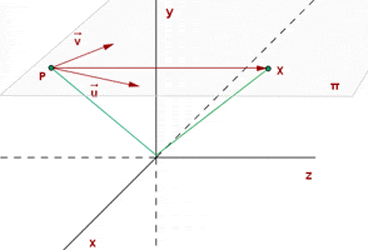 To determine the equation of a plane in 3D space, a point P and a pair of vectors that form a basis (linearly independent vectors) must be known.