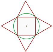 A square is inscribed in a circle of 4 m radius and on the sides of the square are outward pointing equilateral triangles. Calculate the area of this shape.