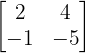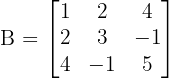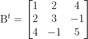 To find the transpose, we switch the rows and columns. Row 1 (1, 2, 4) becomes Column 1. Row 2 (2, 3, -1) becomes Column 2. Row 3 (4, -1, 5) becomes Column 3. The transpose is: