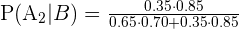A small company has hired two architects to create designs for the clients. Architect 1 makes 65% of the designs and architect 2 makes 35% of the designs. Furthermore, 70% of the designs from architect 1 get approved and 85% of the designs produced by architect 2 get approved. Suppose a design is drawn at random. If the selected design is approved, find the probability that it was made by the architect 2.