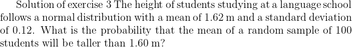 The height of students studying at a language school follows a normal distribution with a mean of 1.62 m and a standard deviation of 0.12. What is the probability that the mean of a random sample of 100 students will be taller than 1.60 m?