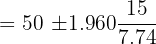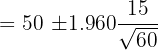 When 60 students in the class were weighed, the average weight came out to be 50 kg and the standard deviation was 15 kg. Assuming a Normal distribution, calculate 95% confidence limits for the mean weight (round off to the nearest whole number) of the whole class. Solution
