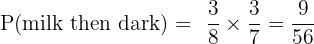 A box contains 8 chocolates: 3 are milk chocolate, 3 are dark chocolate, and 2 are white chocolate. Emma picks two chocolates at random without replacement. What is the probability that she picks one milk and one dark chocolate (in any order)?
