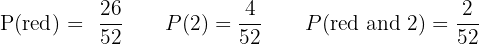 Number of cards that are both red and a 2 = 2 (the 2 of hearts and the 2 of diamonds)