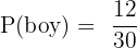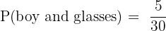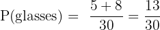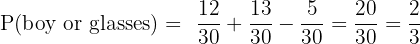 A class has 12 boys and 18 girls. 5 boys and 8 girls wear glasses. A student is selected at random. What is the probability that the student is a boy or wears glasses?