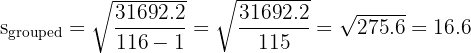 The grouped standard deviation is approximately 16.6.